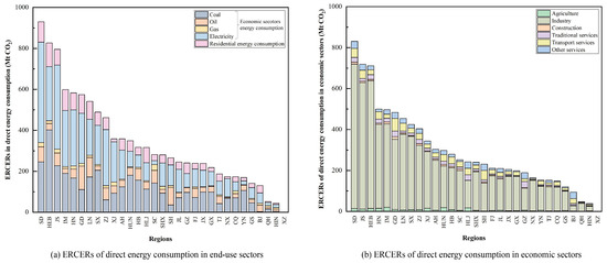 In terms of the direct energy consumption of end-use sectors, the ERCERs are reflected as direct CO2 emissions. End-use sectors emit 10,575.4 Mt of CO2 nationally, among which energy consumption emissions from economic sectors amount to 9138.8 Mt, while those from residential sectors reach 1436.6 Mt, accounting for 13.6%. This notable escalating trend in household energy usage and carbon emissions has become a pressing concern in China’s low-carbon development trajectory [55]. Regional details are presented in Figure 4. Regarding energy sources, electricity consumption in most regions emerges as the primary CO2 emitter, followed closely by coal consumption. Geographically, carbon emissions from energy-related activities within the economic sectors are distinctly concentrated in the eastern regions, such as Shandong, Hebei, and Jiangsu, the primary contributors to direct carbon emissions, located along the eastern coast. As for sectoral distribution, ERCERs from the industrial sector total 7184.3 Mt, significantly exceeding those from other sectors. Our previous work provides the comprehensive analyses of direct energy consumption of end-use sectors across various regions in China [26].