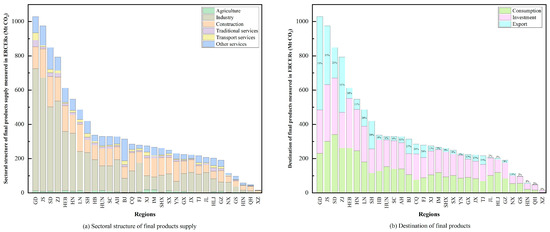In the link to the final products supply, the ERCERs in final products nationally amount to 10,799.1 Mt. Figure 5 shows the sectoral structure and destination of final products produced in each region. Geographically, the distribution of ERCERs embodied in the final products supply closely corresponds to the level of regional economic development. Regions with the highest ERCERs are primarily located in the three major coastal economic zones, such as Guangdong, Jiangsu, Shandong, and Zhejiang, with a notable concentration in the Yangtze River Delta. Conversely, regions with the lowest ERCERs are mainly situated in the northwest, such as Xizang, followed by parts of the southwest and northeast. These coastal regions are characterized by relatively advanced economies, well-established industrial systems, and comprehensive infrastructure. As a result, they exhibit a state of “stable operation,” with a higher proportion of industry and a relatively lower proportion of construction. In contrast, the western regions lag behind in economic development, often lacking complete industrial systems and sufficient infrastructure. These regions are still undergoing extensive capacity building and infrastructure expansion, which leads to a higher share of ERCERs in the construction. Furthermore, regarding the destination of final products produced in each region, a notable feature is that final products from eastern and southern coastal regions, such as Guangdong, Jiangsu, and Zhejiang, account for a large proportion of exports, exhibiting characteristics of an export-oriented economy, whereas those from northern coastal regions, e.g., Shandong and Hebei, are primarily used domestically.