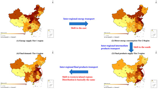 From the above analysis, although the majority of ERCERs associated with the inter-regional transport of energy, intermediate products, and final products remain within their region of origin, accounting for 50.4%, 63.7% and 59.8%, respectively, there are still clear patterns of spatial redistribution following cross-regional transfers, as highlighted in Section 3.1. The overall spatial shifts and distribution of ERCERs are visualized in Figure 8. It can be concluded that China’s ERCER transmissions follow three notable spatial shifts: (1) carbon transfer, driven by the eastward shift in energy from inland coal-producing regions to coastal consumption regions; (2) initial ERCERs transfer, accompanying the transport of intermediate products from the north to the eastern and southern coast provinces; (3) final ERCERs transfer, resulting from the flow of final products to foreign countries and to central and western provinces.