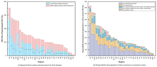 In Tier 2 regions, the ERCERs of end-use sectors represent physically direct carbon emissions. This study decomposes how the final demand in Tier 4 regions drives these direct emissions of Tier 2 regions, as shown in Figure 9a. Among all regions, Shandong exhibits the highest ERCERs attributed to the final demand, with 77.2% of those emissions occurring locally—the highest proportion nationwide. In contrast, only 15.4% of ERCERs driven by Beijing’s final demand occurred within the region itself. These findings suggest that regions with a lower proportion of locally induced ERCERs from final demand generally fall into two categories: (1) regions with highly developed service-oriented economies, such as Beijing and Shanghai, where the final demand is less reliant on local industrial products; (2) regions where a substantial share of the final demand is directed toward gross capital formation, which requires large quantities of industrial intermediate products. As a result, these regions, such as Jilin, Chongqing, and Yunnan, import significant amounts of embodied ERCERs from other provinces through inter-regional trade in intermediate and final products.