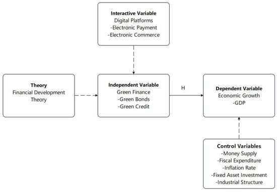 This study’s conceptual framework integrates green finance and digital platforms within the broader perspective of financial development theory. The theory underscores the role of financial innovations in fostering inclusive and sustainable growth. Green finance channels resources into environmentally beneficial sectors, while digital platforms improve the reach and efficiency of financial services [38]. Their interaction contributes to better capital mobilization, risk mitigation, and innovation diffusion, which are key channels through which economic growth is promoted.