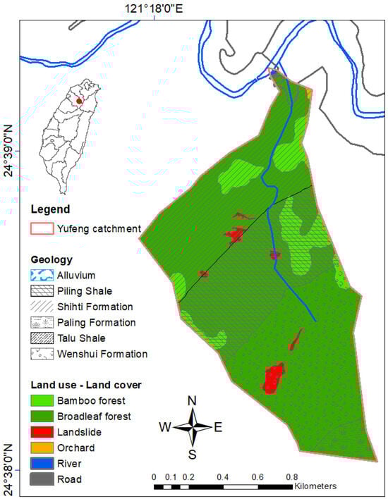 Location of the study area in northern Taiwan (inset, red dot) and detailed catchment map of the Yufeng No. 2 stream showing watershed boundaries, geology, and land use/land cover. The map also includes a coordinate grid, north arrow, and scale bar.