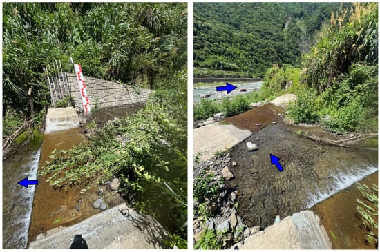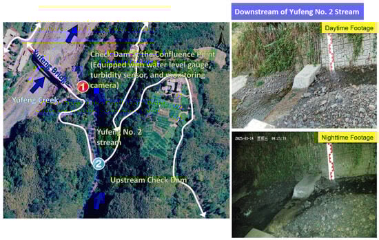Additional field observations were conducted to document the local channel morphology and hydraulic conditions. Figure 4 shows two photographs taken during the site visit on 23 July 2025. The left image captures the exit of the Yufeng No. 2 stream, while the right image provides a view toward the Yufeng Creek, illustrating the physical connection between the monitored torrent and the main river system.