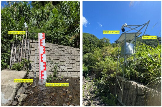 Instrumentation installed at the site included a water level gauge, turbidity sensor, Doppler radar, and a CCD camera powered by a solar panel. Figure 5 illustrates these installations. The left image shows the water level gauge and turbidity measurement device, as well as the position where the Doppler radar was aimed to capture flow velocity. The right image depicts the CCD camera mounted on a steel frame with an integrated solar power system, ensuring continuous operation in remote conditions.