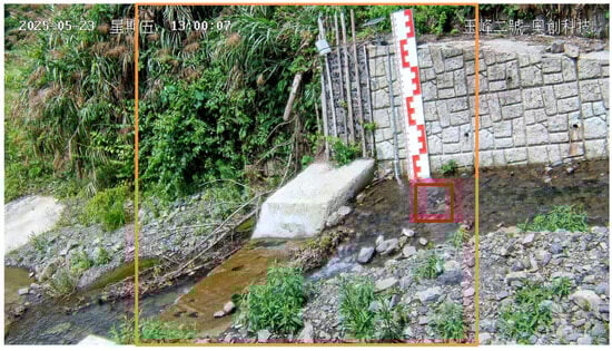 - Focused Cropping: A smaller area of the frame, corresponding to the water surface region (as indicated by the red square in Figure 6), was cropped without downsampling. This method preserved finer spatial details of the flow while excluding background elements such as vegetation and banks that could introduce noise.