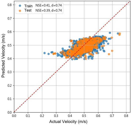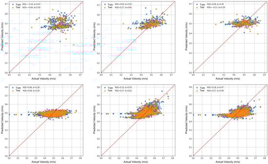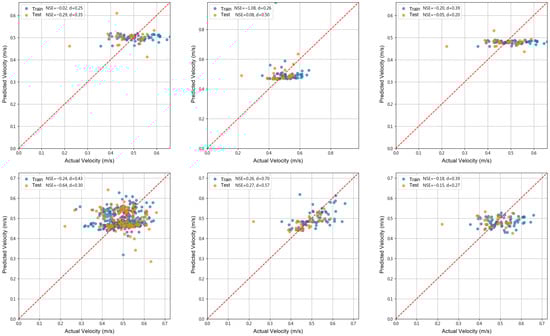 Experiments were conducted using 100 video samples under three input configurations: (i) RGB frames only, (ii) optical flow fields, and (iii) combined RGB and optical flow (feature-level fusion). Figure 7 presents a visual summary of the results for these configurations, organized into a 2 × 3 layout: the first row corresponds to full-scene images and the second row corresponds to cropped water surface images. The columns represent RGB-only, optical flow-only, and combined RGB+flow inputs, respectively. Each plot displays the predicted versus observed flow velocities for the training and testing sets, along with corresponding NSE and d-statistic values.