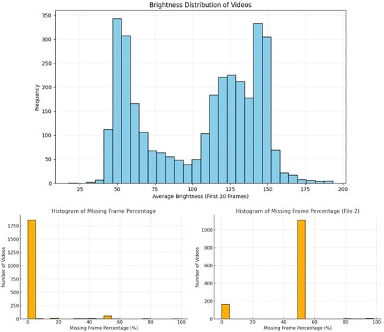 Figure 9 presents three plots summarizing these analyses. The first plot shows the brightness distribution of all videos, which exhibits a clear bimodal pattern. Videos with higher brightness values correspond to daytime conditions, whereas those with lower brightness represent nighttime recordings. This distinction was used to classify videos into daytime and nighttime subsets.
