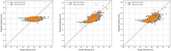 Figure 8 illustrates the results for the two largest subsets (465 and 2979 videos) arranged in a 2 × 3 layout. The first row corresponds to the 465-video set and the second row corresponds to the 2979-video set. Columns represent RGB-only, optical flow-only, and combined RGB+flow inputs, respectively. For reference, the case using 100 videos is presented earlier in Figure 7. Each plot shows predicted versus observed flow velocities for both training and testing sets, along with the corresponding NSE and d-statistic values.