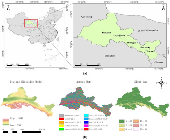 The study area is defined by specific longitudinal and latitudinal coordinates, ranging from 92°44′ East to 104°14′ East and from 37°15′ North to 42°49′ North. This region encompasses five prefecture-level cities: Wuwei, Jinchang, Zhangye, Jiuquan, and Jiayuguan, along with their respective counties and districts. The total area of the study region is approximately 250,000 square kilometers, as illustrated in Figure 1a [15].