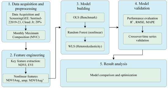 The technical roadmap, as illustrated in Figure 2, encompasses all key steps from data acquisition to final result analysis. Initially, Sentinel-2 data is acquired and filtered using the Google Earth Engine platform. The Maximum Value Composite (MVC) technique is employed to preprocess the data for the maize growing seasons from 2019 to 2023, ensuring spatiotemporal consistency and reducing the impact of cloud contamination. Following data preprocessing, feature extraction is conducted, primarily focusing on crucial vegetation indices such as NDVI and EVI. Additionally, nonlinear features, including the quadratic term of August NDVI (NDVIAug2), are introduced to better capture the complex relationship between vegetation indices and maize yield. Subsequently, three models—Ordinary Least Squares (OLS), Random Forest (RF), and Weighted Least Squares (WLS)—are constructed, and their performances are evaluated and cross-validated. By comparing the performance metrics of different models, including R2, RMSE, and MAPE, the WLS model is ultimately selected as the primary yield estimation model, and its results are further optimized.