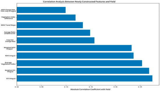 Correlation analysis of newly constructed features and maize yield. The X-axis shows the absolute correlation coefficient of each feature with maize yield, indicating the strength of the relationship. The Y-axis lists the newly constructed features, including various vegetation indices and other relevant factors, ordered by their correlation with yield. This figure highlights the relationship between these features and maize yield, with stronger correlations placed higher on the Y-axis.