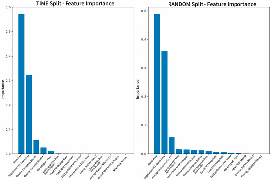 As illustrated in Figure 6, during the time series partitioning, features such as the rate of change in the vegetation index and NDVI exhibit greater sensitivity. This suggests that the temporal variations in these features significantly influence the model’s predictions. In contrast, when employing random partitioning, the ranking of feature importance remains more stable, and the model’s fitting performance is more consistent with random data splits. These findings underscore the distinct effects that different data partitioning methods have on model performance.