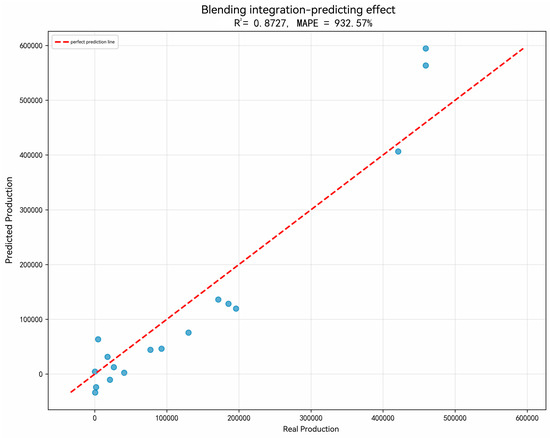 Blending model prediction results. This figure shows the relationship between actual and predicted Maize yield by the Blending model, with each point representing a county-year. The red dashed line indicates the perfect prediction line (y = x). The scatter plot demonstrates the model’s prediction performance, highlighting regional variations.