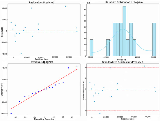 To evaluate the model’s fit and potential bias, this study performed a systematic diagnostic analysis of the prediction residuals. Figure 17 presents four key diagnostic plots: