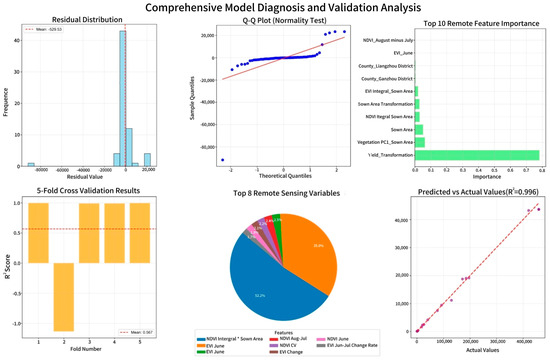 This figure includes several diagnostic results: the top-left plot displays the residual distribution with the mean indicated by a red dashed line, highlighting how well the model fits the majority of data points; the top-right plot is a Q-Q plot testing the normality of the residuals, with most points aligning closely to the diagonal; the bottom-left plot shows the results of 5-fold cross-validation, providing an assessment of the model’s stability; the bottom-right plot compares the predicted values against the actual ones, with a regression line to visualize the fit; the middle plot displays the importance of the top 15 features, and the right-middle plot shows the contribution of temperature-sensitive variables to the model’s performance.