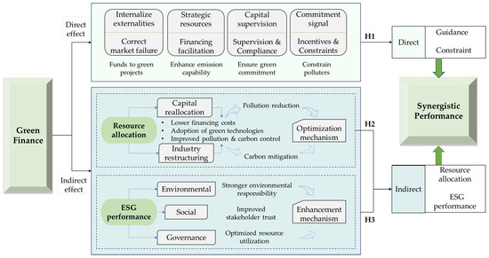 Green finance responds to the sustainability demands of multiple stakeholders, including governments, investors, and communities. By transmitting market signals, it incentivizes firms to strengthen their environmental and social responsibilities. This, in turn, drives improvements in environmental, social, and governance (ESG) performance and enhances the synergistic effects of pollution and carbon reduction [47]. Specifically, on the environmental dimension, green finance incentivizes firms to increase their investment in environmental protection. It promotes the adoption of clean technologies and the upgrading to end-of-pipe controls. These measures enable comprehensive pollution management. On the social dimension, green financial institutions support clean investments while restricting financing for pollution-intensive activities. These actions lower firms’ environmental and social risks. They also reduce energy consumption and pollution intensity by improving social performance [48]. On the governance dimension, financial institutions participate in corporate governance practices. They guide firms to integrate environmental governance into strategic planning and operational management. This process enhances the structure and effectiveness of environmental oversight systems. These pathways collectively drive firms to intensify ESG investments and improve resource allocation efficiency. Ultimately, they enable synergistic reductions in both pollutants and carbon emissions. Thus, we propose the following hypothesis: