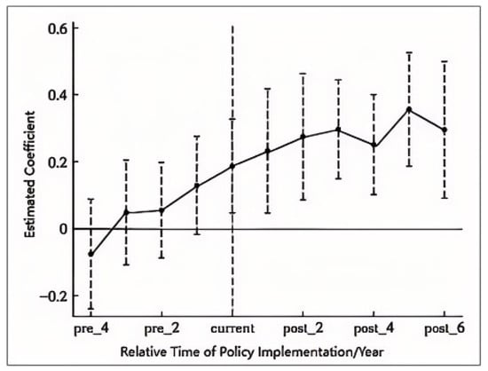 Parallel Trend Test Between Pilot and Non-Pilot Regions. Note: The horizontal axis represents the relative time phases of policy implementation (pre_4: 4 years before policy implementation; pre_2: 2 years before policy implementation; current: policy implementation year; post_2: 2 years after policy implementation; post_4: 4 years after policy implementation; post_6: 6 years after policy implementation); the vertical axis represents the estimated coefficient of the policy effect on green technology innovation. The error bars show the 95% confidence interval. It can be seen that the coefficients are not statistically significant in the phases before policy implementation (pre_4, pre_2), confirming the parallel trend assumption.