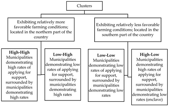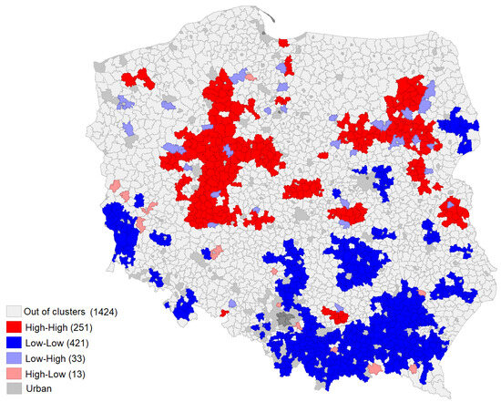 The analysis was grounded in the research conducted by Kiryluk-Dryjska, Więckowska, and Sadowski [21]. In their work, the authors demonstrated the existence of territorial clusters of rural areas in Poland, in which the rate of applications for the measure “Modernisation of agricultural holdings” was above or below the national average. The analysis was conducted at the local level, specifically NUTS 5 (municipalities), which corresponds to the smallest administrative units in Poland. The analysis encompassed both rural and urban-rural municipalities. The coefficients of frequency of application by farmers for funding under the analyzed measure of the 2007–2013 RDP were calculated based on the number of applications for support submitted by farmers under the measure “Modernisation of agricultural holdings” compared to the total number of farms in the municipality. The empirical Bayesian smoothing routine was applied to the calculated indicators [22]. In a subsequent step, the authors implemented the global Moran (I) statistic [23] to ascertain the presence of spatial autocorrelation in the index. They also employed a local version of the Moran statistic (developed by Anselin [24]) to determine whether neighboring municipalities exhibit clusters of similar index values. Kiryluk-Dryjska et al. [21] demonstrated the presence of clusters in Poland exhibiting varying frequencies of application for investment funds of the 2007–2013 RDP under the measure “Modernisation of agricultural holdings.” The identified clusters are distributed across the landscape as illustrated in Figure 1.