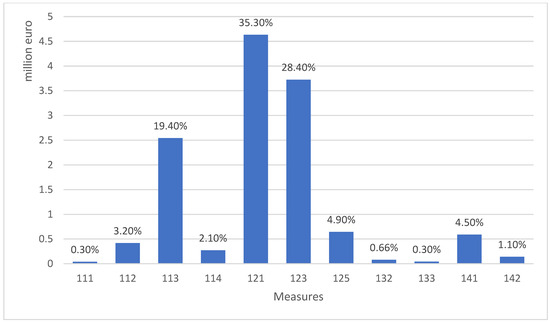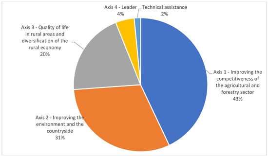 The 2007–2013 RDP budget was EUR 17.4 billion, 75% of which was EAFRD support. The program was implemented under four priority axes (Council Regulation (EC) No. 1698/2005). Measure 121, “Modernisation of agricultural holdings,” was part of Axis 1, “Improving the Competitiveness of the Agricultural and Forestry Sector,” which received the largest amount of payments. Approximately 43% of the entire RDP 2007–2013 budget was allocated to its implementation (Figure 2). At the same time, the funds spent on implementing the analyzed measure accounted for as much as 35% of the expenditures under Axis 1 (Figure 3) and ca. 14% of the total program budget [28]. By the end of 2015, more than 73,000 contracts had been signed under the measure [29]. The measure’s significant role in the context of financial support from EU funds in the process of modernizing farms is evident, given its large share of the 2007–2013 RDP budget.