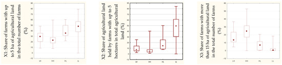 A box-and-whisker chart illustrating the level of agricultural development in terms of the analyzed indicators in the studied clusters in Poland. Source: own compilation.