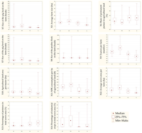At the initial stage of the research, the significance of the differences between the variables defined for the study (based on 2010 data) was assessed for all municipalities in each cluster, based on the calculated indicators of the level of agricultural development in Poland. To this end, analysis of variance was performed using the Kruskal–Wallis ANOVA rank test. It revealed that, at baseline in 2010, High–High and Low–High cluster municipalities in the northern part of the country had similar economic conditions. A similar situation occurred with the Low–Low and High–Low cluster municipalities located in the southern part of the country. In most cases, no statistically significant differences were found at the p < 0.05 significance level between clusters located in the same regions of Poland (Table 2). However, statistically significant differences in the levels of variables were discovered between northern and southern clusters. The results of the analysis of variance, which showed the similarity of business conditions between the High–High and Low–High and the Low–Low and High–Low areas, formed the basis for further analysis and for constructing a scheme to compare municipalities in clusters. The graphical results demonstrate that the distributions of the majority of the analyzed indexes are similar between the High–High and Low–High areas, and between the Low–Low and High–Low areas (Figure 4). A simplified comparison scheme is presented in Figure 5.