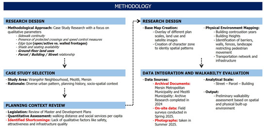 The methodology of this study is structured around a case study approach to examine the implications of planning decisions and to develop strategies that promote pedestrian movement within neighborhoods (Figure 1). For this purpose, Viranşehir Neighborhood, located in the Mezitli district of Mersin, was selected due to its distinct planning history and social structure, which have given rise to diverse urban patterns.