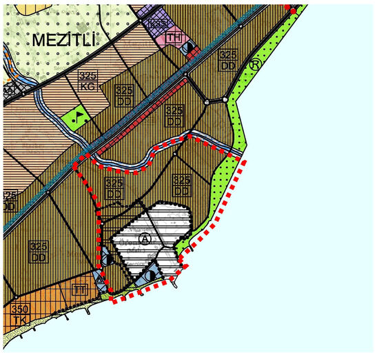 Mezitli District, within the boundaries of Viranşehir Neighborhood, was included in the boundaries of MMM with the legal arrangements made in 2008. For this reason, Mezitli District was excluded from the planning area in the upper-scale plans made during the urban development periods of Mersin in the 20th century. The upper-scale comprehensive planning decisions to cover Mezitli District were developed in the “Mersin 1/25.000 Scale Master Plan” approved by the MMM. Council decision dated 10 March 2008 and numbered 145. This plan is an upper-scale settlement scheme plan covering the Metropolitan Municipality Boundaries, which expanded after the legal and administrative regulations after 2004, and plan decisions have been produced for the important development directions of the city. In the 1/25.000 scale Master Plan dated 2008, Viranşehir Neighborhood is envisaged as “Areas to be Improved by Correcting Density and Building Layout” with a density of 325 people/ha and DD notation means rehabilitation (Figure 3).