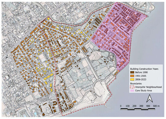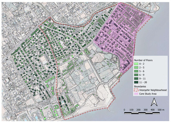 In addition to the information and documents obtained from the institutions during the research process, the built environment was analyzed through detailed field observations and observations covering Viranşehir Neighborhood. Firstly, the building age of the built environment in the area was determined. Orthophoto aerial photographs of the area dated 1990 and 2005 and related datasets were taken into consideration in determining the building age. When we make an evaluation in this context, it is seen that there was construction on the coastline before 1990. Between 1990 and 2005, there was a very intensive construction in the area guided by the Development Plans. After 2005, this development continues (Figure 9). When the number of stories of the buildings is evaluated, it is seen that there are mostly 2-storey buildings within the conservation boundaries of the ancient city. While the buildings constructed in earlier years have fewer stories, especially the buildings constructed after 2005 have 11 stores or more (Figure 10).