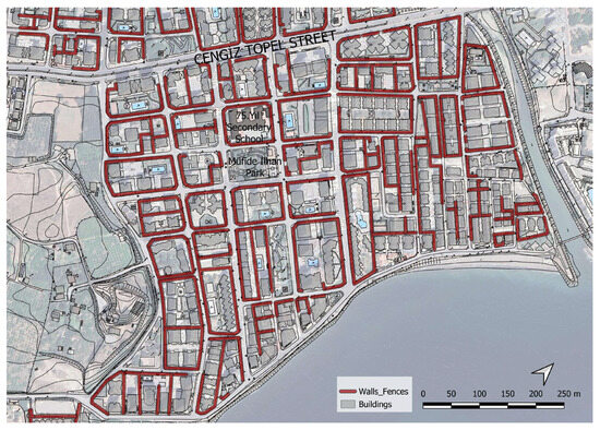 Afterwards, the number of stories and land use of the built environment were determined through field observations. In addition to the buildings, factors such as walls and fences around the parcels or blocks that restrict pedestrian movement were also identified. In addition, determinations were made regarding the transportation scheme. Based on the archival data and fieldwork, an assessment of pedestrian movement is presented on the street–parcel–building scale as a qualitative micro-scale study.