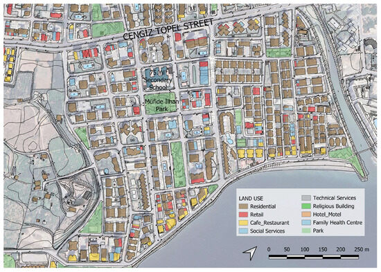 In the detailed field observations and determinations made to cover the Viranşehir and Menderes Neighborhoods, basic land uses were also identified. The most basic use in the Menderes and Viranşehir Neighborhoods is residential use. The majority of the upper floors are in residential use. However, there are also different foci of use within the area in question. With the uses on the D400 Highway axis, the area is a sub-center that provides service to Mezitli District. Neighborhood sub-centers are located on main streets like Cengiz Topel Street. Along the coastline there are cafes and restaurants that determine the social spine for the near environment. However, there are no attractive activities and land use around the core area (Figure 12).