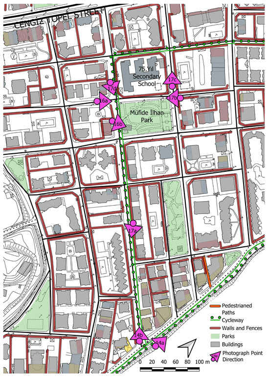 From a quantitative perspective, the spatial organization of the neighborhood ensures compliance with standards for public service accessibility in terms of walking distances and service capacities. Nevertheless, as previously noted, the physical quality of pedestrian infrastructure adversely affects walking behavior, particularly with regard to safety and the visual or experiential appeal of pedestrian routes (Figure 15, Figure 16 and Figure 17).