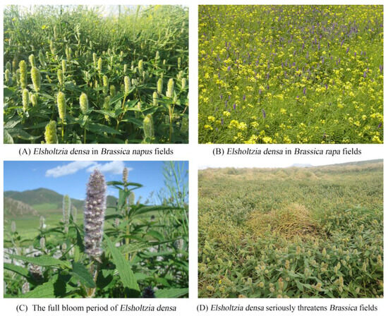 After ripening, Elsholtzia densa can reach a height of more than 1.5 m, with numerous branches, abundant flowers, and lush foliage. Its high seed set rate results in a large number of seeds remaining in the soil, which have the characteristics of early germination, high density, and rapid growth. Certain organs of the Elsholtzia densa have allelopathic effects and tend to form dominant populations. As it continues to expand, the volatile allelopathic substances produced by its flowers and leaves inhibit the growth of other plants’ root systems and even entire plants [40]. As one of the most harmful weeds in the farmlands of the Qinghai–Tibet Plateau, Elsholtzia densa reproduces strongly and spreads rapidly, giving it a competitive advantage in population dispersion and settlement. Not only has it caused great harm to the quality and yield of rapeseed, but it has also led to changes in the plant species composition of the alpine meadows of the Qinghai–Tibet Plateau [41]. Elsholtzia densa is currently widely distributed in northwestern and southwestern China, which is consistent with the results of this study.