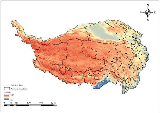 Distribution of Elsholtzia densa on the Qinghai–Tibet Plateau. This figure was created using a map of the Qinghai–Tibet Plateau downloaded from the National Qinghai–Tibet Plateau Science Data Center website (https://data.tpdc.ac.cn/home, accessed on 23 June 2024) [28]. The base map has not been modified. The same applies to the following figures.