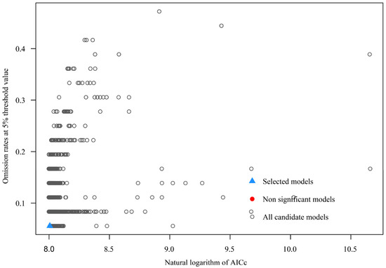 The R package “kuenm” was implemented to optimize feature combinations (FCs) and regularization multipliers (RMs) in MaxEnt models. Model selection was guided by the principle of parsimony to enhance model transferability—a critical aspect for extrapolation into novel climates. We used the corrected Akaike Information Criterion (AICc) for small sample sizes, which penalizes model complexity, to identify the model that best explains the data with the fewest parameters. The model with the lowest AICc value was selected as optimal, as it is theoretically less prone to overfitting and thus expected to demonstrate more reliable predictive performance when extrapolating [31]. Combinatorial validation was conducted by systematically testing the RM values (0–4 in 0.1 increments) against FC(LQPTH). The definitive model was determined using three criteria: statistical significance, omission rate below 5%, and the corrected Akaike Information Criterion (delta AICc) < 2 (with delta AICc = 0 prioritized) [17].