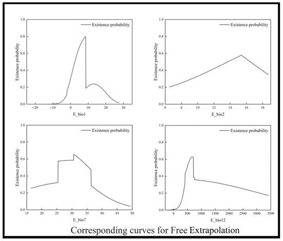 The response curves of key environmental variables under the Free Extrapolation method. X-axis: range of the climatic factor; Y-axis: probability of occurrence. Hereafter, these are the same.