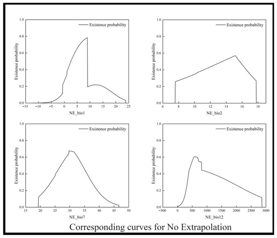 We inferred from observing the response curve that different extrapolation methods caused non-significant variations in environmental determinants but modulated probability extremes: E showed increasing or decreasing trends, EC stabilized both extremes, and NE nullified probability thresholds.