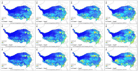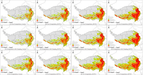 The results of this study indicate the range of variation under 10 repetitions of the model, as shown in Figure 12, with the blue area indicating a smaller range of variation over 10 repetitions, while the red area indicates a large range of variation over 10 repetitions. We find that the different extrapolation methods do not have a significant effect on the range of variation in the model repetitions, but the red area gradually increases with the intensification of the future climate scenarios. In the northwestern direction of the Tibetan Plateau, Bayinguoleng Mongol Autonomous Prefecture, Hotan City, Golmud City, Ali Region, the northern part of Nagchu City, and the western part of the Yushu Tibetan Autonomous Prefecture, the variance changes in these areas are small, and the repeatability and reliability are better; whereas in most areas in the southern and eastern parts of the Tibetan Plateau, e.g., in Yunnan, Sichuan, Gansu, the southern part of the Tibetan Autonomous Prefecture, and the eastern part of Qinghai, the 10 repetitions of the variations were larger, with lower repeatability and reliability.