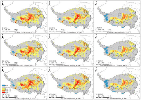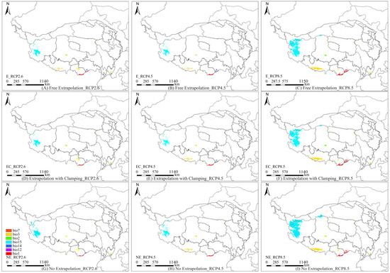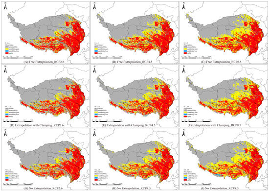As shown in Table 5, with increasing greenhouse gas concentrations significantly affecting the distribution of Elsholtzia densa, the potential suitable area for Elsholtzia densa expanded significantly under the three future climate scenarios and mainly shifted to the central Tibetan Plateau. The distribution of Elsholtzia densa is becoming increasingly widespread, with a trend towards an increase in the current suitable habitat area. In particular, under the RCP8.5 scenario, the increase in the area of the high suitability zone under all extrapolation methods exceeded 25 × 104 km2, with the trend of the increase reaching a maximum of 37.07 × 104 km2. Under the future climate scenarios, different extrapolation methods had different effects on the area of Elsholtzia densa, and the total area of the suitable zone was as follows: No Extrapolation > Extrapolation and Clamping > Extrapolation. It was also found that under the No Extrapolation approach, Elsholtzia densa had the greatest trend of growth in potential suitable areas, which increased by 67.43 × 104 km2 under the RCP8.5 scenario, an increase of 13.78 × 104 km2 and 4.11 × 104 km2 compared with the E and EC approaches, respectively.