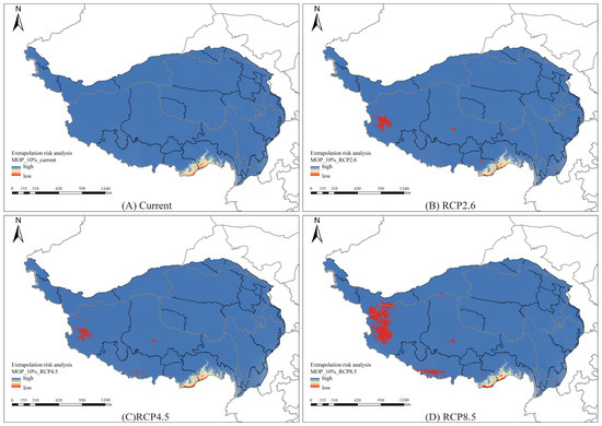 Model extrapolation risk was evaluated using the kuenm_mmop function (10% threshold), producing MOP rasters (0–1 scale), where 0 denotes high environmental dissimilarity, and higher values reflect greater similarity. Elevated extrapolation risk indices were correlated with improved habitat suitability and enhanced environmental analog assessments of ENM outputs [38].