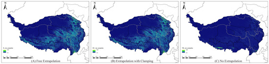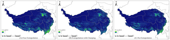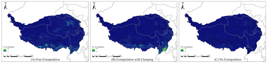 Figure 13 shows the effect of the three extrapolation methods on the variance value of the 10 repetitions of the results; the three extrapolation methods do not have a significant effect on this result, and the main regions with large changes in the variance value of the 10 repetitions were Yunnan Province, the southern part of the Tibet Autonomous Prefecture, and the Haixi Tibetan-Mongolian Autonomous Prefecture, which show low reliability in multiple repetitions, while the other regions are more accurate. Especially in the northwest of the Tibetan Plateau, this result is similar to the variance range of model repetitions under different extrapolation methods, particularly in the northwestern Tibetan Plateau where the results are consistent and more accurate.