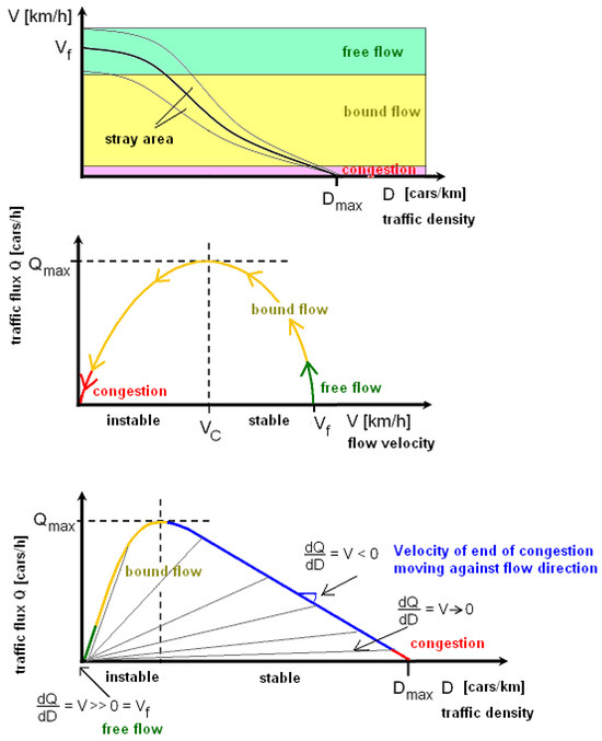 Among these, the most important is the flow–density relationship (the fundamental diagram) under steady-state traffic conditions for identical driver–vehicle units [10]. The FD allows making a number of statements on the macroscopic (i.e., average) features of the traffic flow, such as the value of free-flow speed and flow capacity, distinction between uncongested and congested regimes, and breakdown phenomena [11].