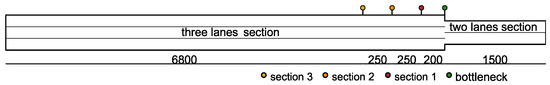 Three cross-section detectors are located along the road at approximately 6800, 7050, and 7300 m downstream of the starting point. In each counting section, one detector per lane is considered. Each cross-section detector collects data about passing vehicles and their individual speeds; the data are aggregated using three different time intervals (1 min, 3 min, and 5 min). Figure 3 shows an illustration of the simulated road stretch.