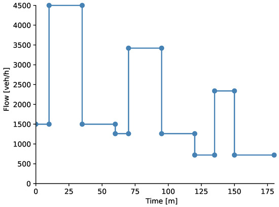 The traffic demand is synthetically generated as shown in Figure 4, and the simulation lasts for 175 min. The input flow is held constant at 1500 [veh/h] for 10 min, then it is increased to 4500 [veh/h] for 25 min to activate the bottleneck. The flow is then decreased to 1500 [veh/h] for 25 min and further down to 1260 [veh/h] for 10 min. The flow increases again to 3420 [veh/h] for 25 min to activate another bottleneck, and is subsequently decreased to 1260 [veh/h] for the congestion to clear. Finally, the flow increases once more to 2340 [veh/h] for 15 min, and then it drops to 720 [veh/h]. This pattern creates three distinct peaks in demand, stressing the road network under both congested and uncongested conditions and including multiple phases of congestion formation and dissolution.