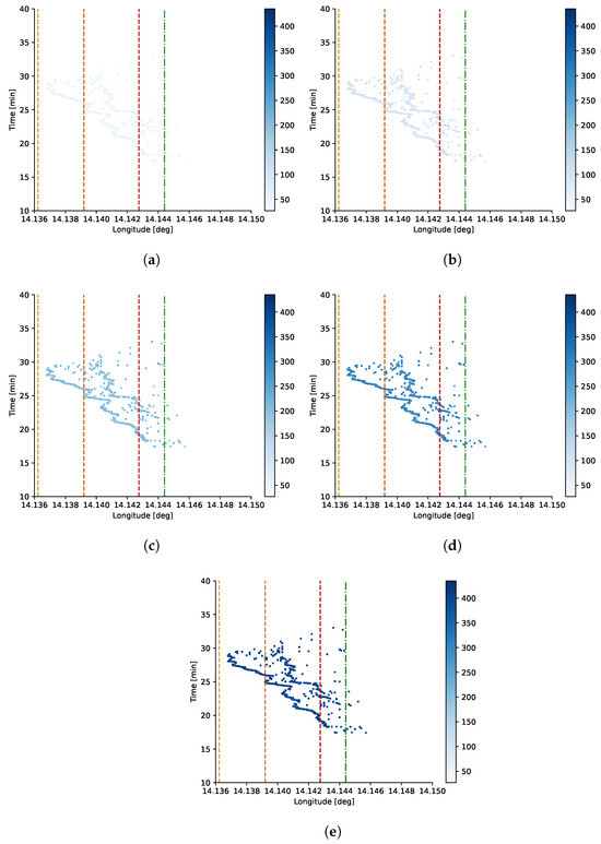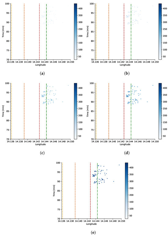 Distribution of the first activations for each CCV in the first hour of simulation, divided by penetration rate. In red, orange, and yellow, the longitudinal positions of detectors 1, 2, and 3, respectively. In green, the bottleneck position. (a) 5% penetration. (b) 10% penetration. (c) 20% penetration. (d) 30% penetration. (e) 40% penetration.
