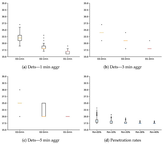 Boxplots of the first detection time in the first hour of simulation. (a) Detectors with 1 min aggregation. (b) Detectors with 3 min aggregation. (c) Detectors with 5 min aggregation. (d) Traffic Jam Ahead service (varying penetration rates).