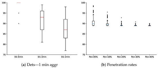 Boxplots of the first detection time in the second hour of simulation. Only detector 1 is shown, since detectors 2 and 3 recorded no detections (see Table 2): (a) Detector 1 with 1 min and 3 min aggregation; (b) Traffic Jam Ahead service (varying penetration rates).