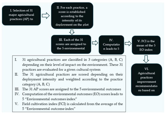 The “Field Cultivation Index” (FCI) is a easy-to-use tool based on scientifically recognized evaluation methods [24,25,26,27,28] and economic operator initiatives [29,30,31], and has been adapted to the specific operational context of the cosmetic-related supply chains presented in the introduction. Figure 1 summarizes the six phases of the FCI methodology.