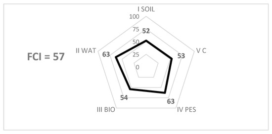 Example of a FCI assessment for a crop—FCI, 5 environmental outcomes index and diagram (radar). SOIL: Soil outcome; WAT: Water outcome; BIO: Biodiversity outcome; PES: Pest management outcome; C: Carbon outcome.