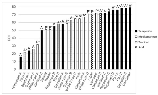Main results of FCI assessments carried out. A: Annual crop; P: Perennial crop; *: organic certification. For the same crop evaluated in different agricultural systems, the letter A, B or C is mentioned in order to differentiate between them.