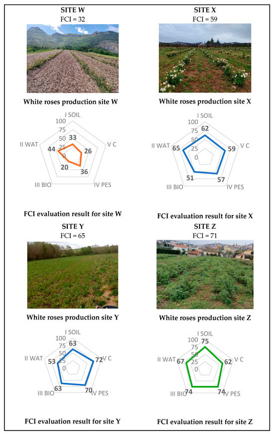 FCI evaluation results for 4 white roses production sites (W, X, Y, Z).